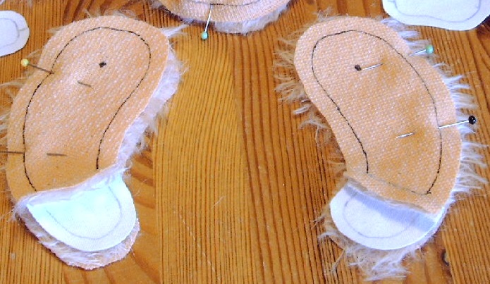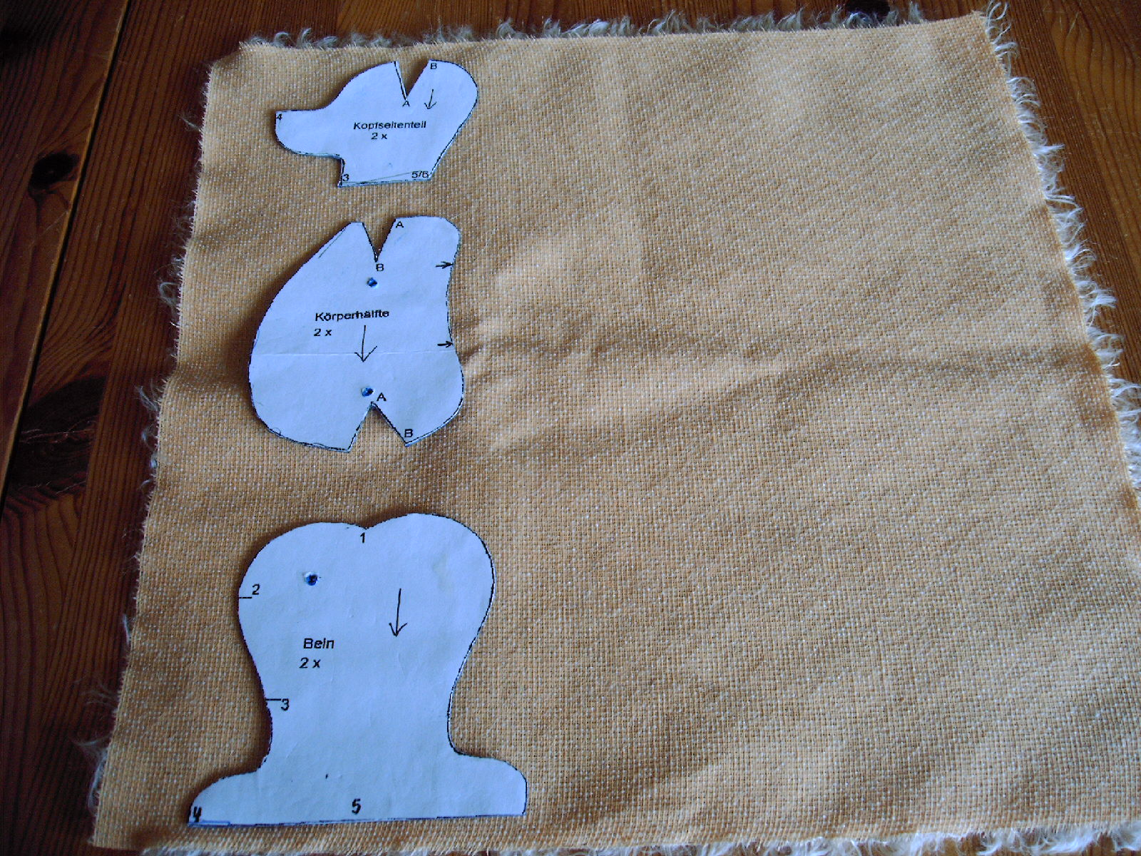 Pfoten und Sohlen nur je 1 x aus Pfotenstoff zuschneiden. Alle Schnitteile mit